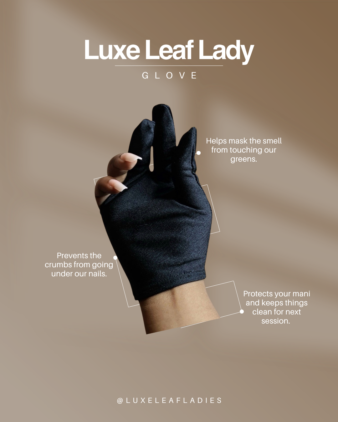 As a Luxe Leaf Lady, we use our Lady gloves so we can mask the smell from our fingers and prevent any leftover crumbs from getting under our nails. Our Luxe Leaf Lady glove is available now in our store!